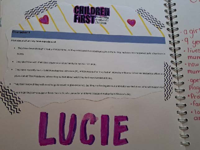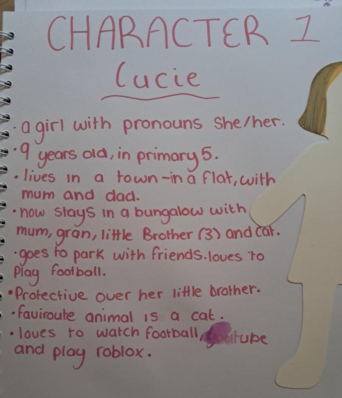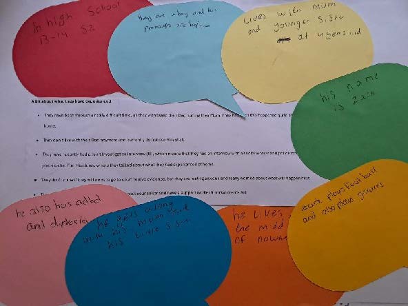 To support ongoing conversations and reflections, each group created a fictional character to help them view discussions through the character’s eyes. To do this, examples of fictional, yet realistic young people were prepared with no detail about who they were. Each group then chose a character to develop and added details about their life to make them ‘come alive’.
